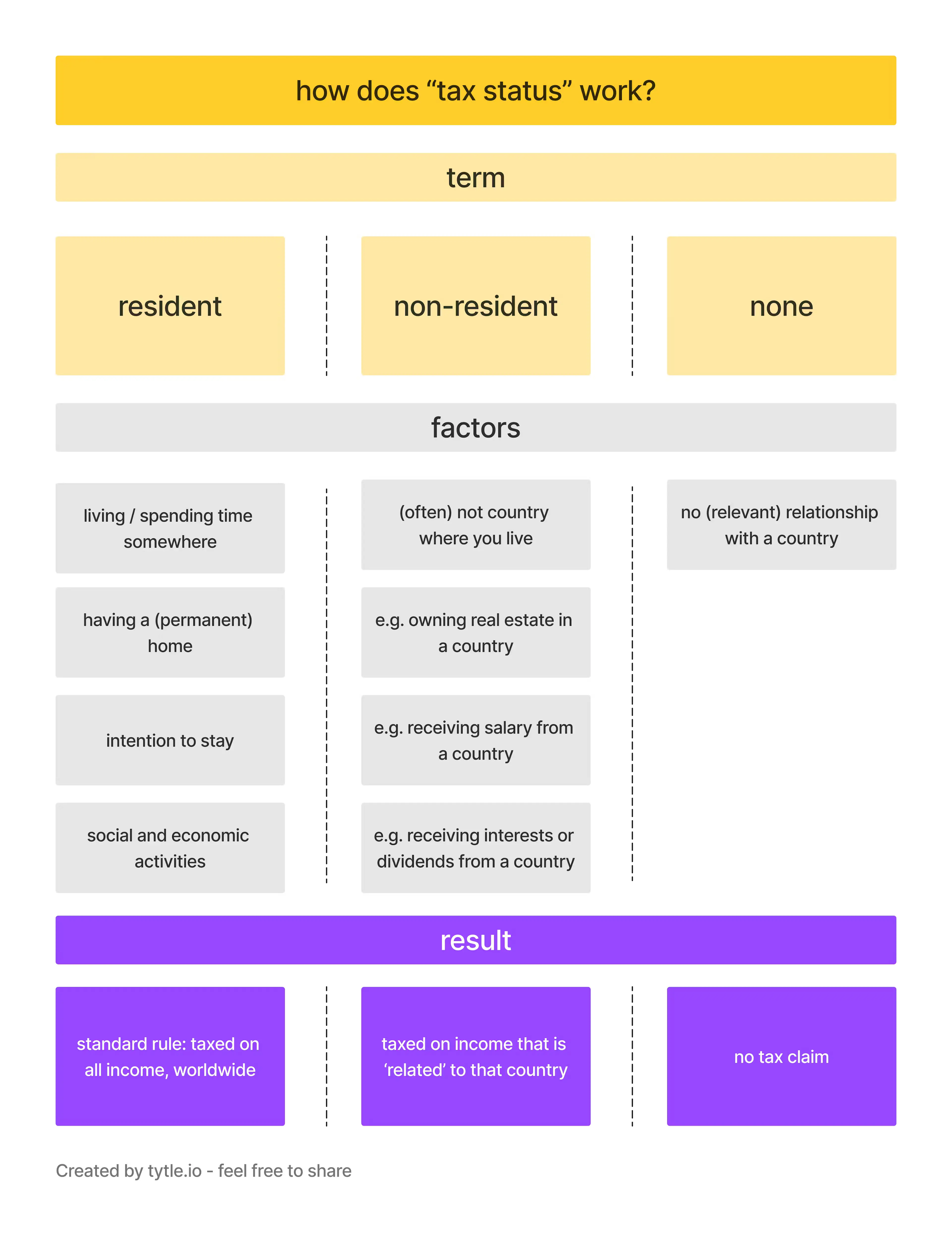 - You don’t live in a certain country, but you still have a relationship with it. For example: you work there part of the year, you have assets there, or you get income from that country. You may be considered a non-resident for tax purposes. This is the “middle position”: there’s no full tax residence, but for certain sources of income you can still be tax liable.